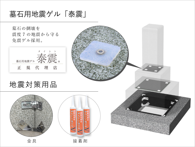 「泰震」とは震度7クラスの地震から、墓石の倒壊を防ぐために開発された商品です。